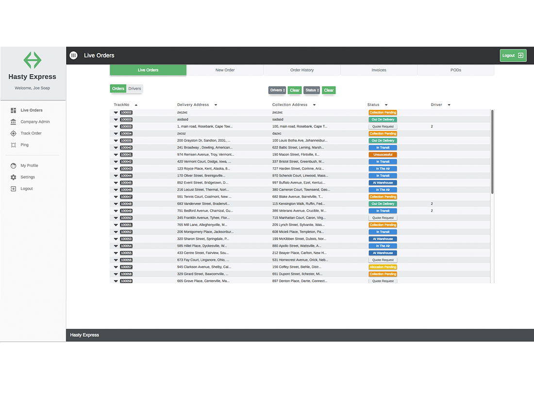 The backend is a Django application communicating using Django Rest Framework and Firebase API. Waybills and Invoice PDF’s are created in real time using a combination of ReportLab and WeasyPrint. The thousands of communication emails are dispatched via SendGrid
